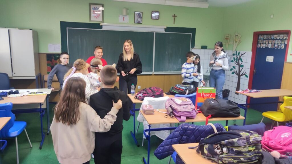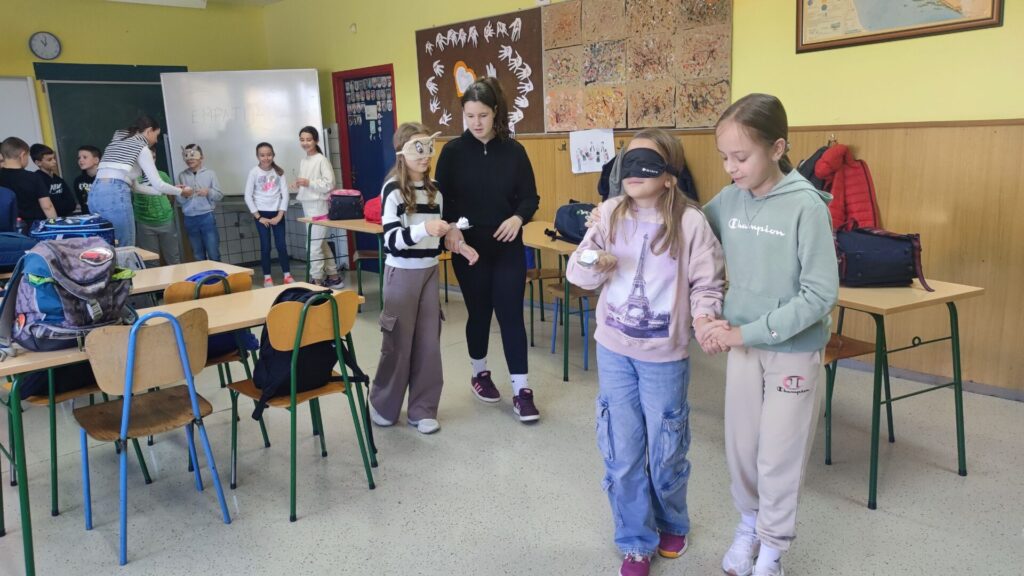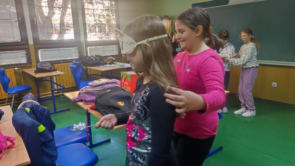 Nakon čitanja i razgovora, uslijedila je igra u kojoj su učenici, u paru, imali zadatak obavljati jednostavne zadatke s povezom preko očiju. Na taj su način iz prve ruke mogli osjetiti koliko su osjetila poput dodira i sluha važna kada nedostaje vid. Ova igra nije bila samo zabavna, već je i dodatno učvrstila timski duh, jer su djeca morala surađivati, pomagati jedni drugima i uvažavati potrebe svojih prijatelja.