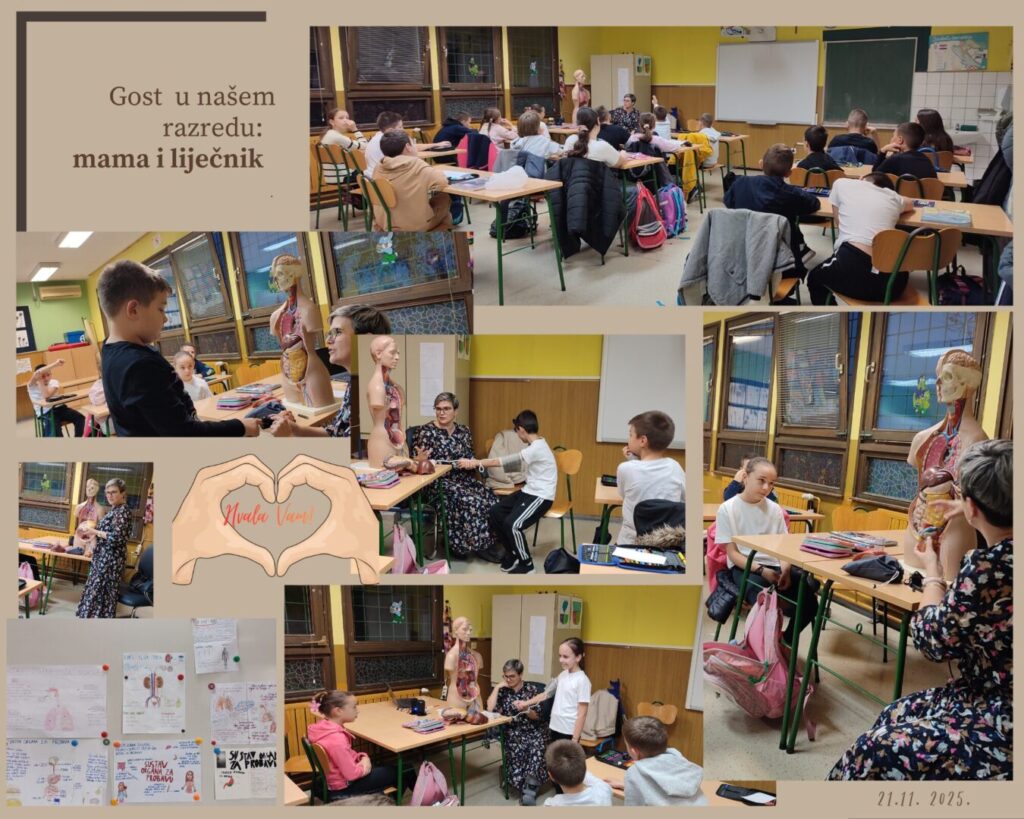 Poseban doživljaj bio je posjet gostujuće liječnice, mame našeg učenika. Ivana Ivanković-Pavelka, dr. med., spec. interne medicine i uži spec. nefrologije, objasnila nam je kako se postaje liječnik, ispričala brojne zanimljivosti o ljudskim organima, dijalizi i važnosti očuvanja zdravlja. Mjerili smo puls, a na modelu ljudskog tijela provjerila je koliko smo naučili – i pokazali smo da znamo puno!