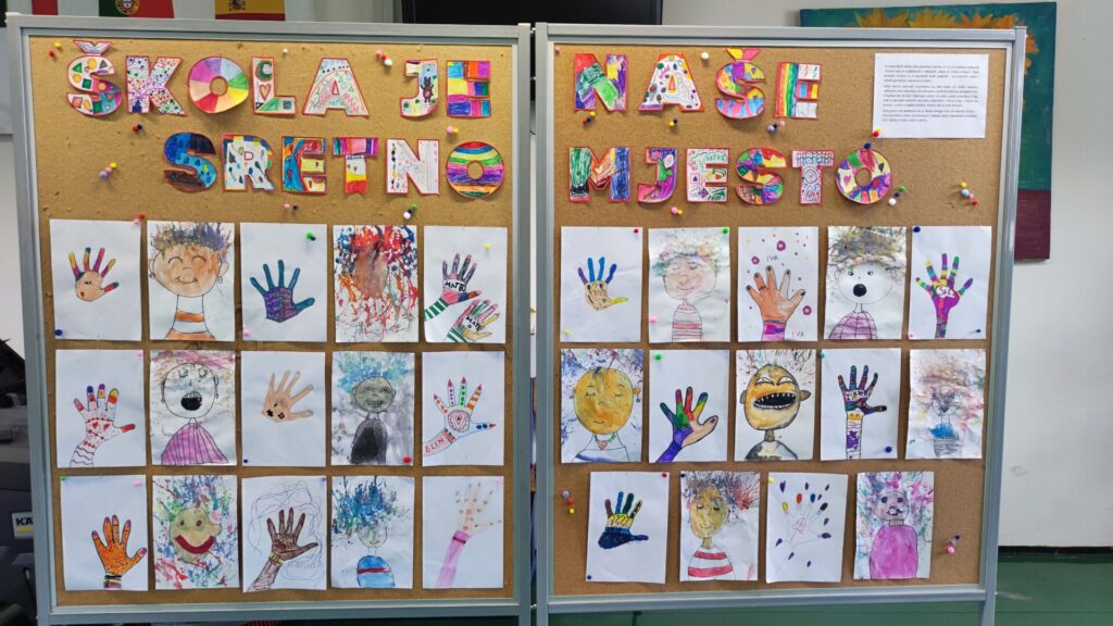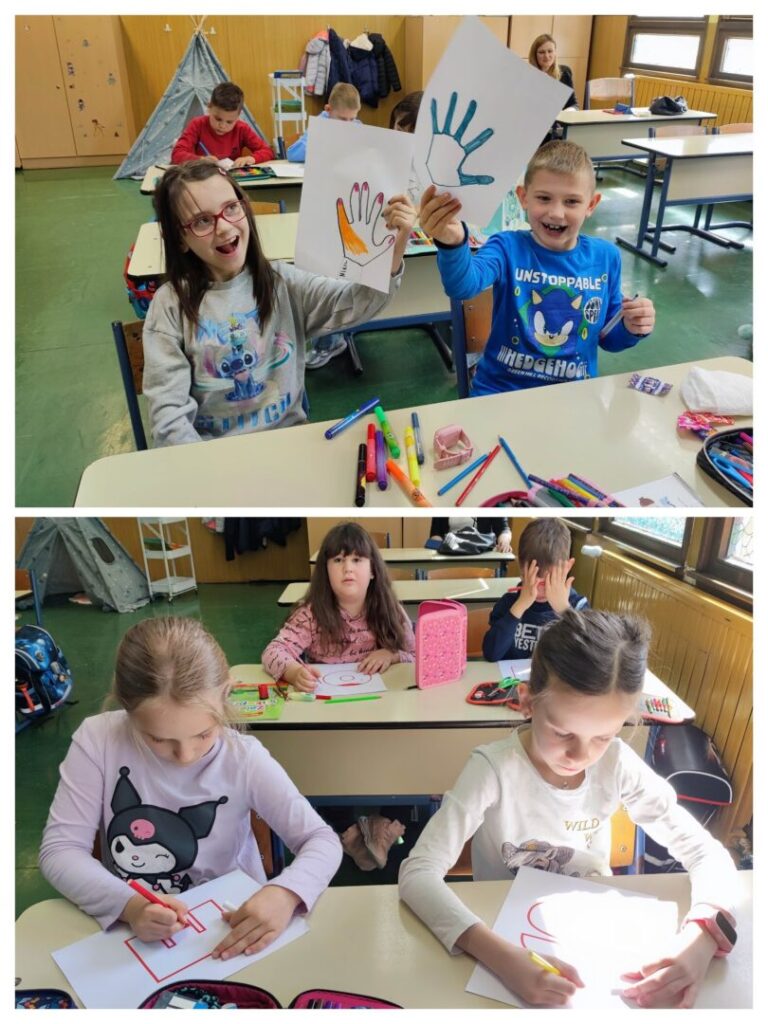 Kako bismo sačuvali uspomenu na ovu posebnu radionicu i naše male, ali velike sanjare, učenici su izradili svoje autoportrete kojima smo ukrasili pano u holu škole. Svaki rad nosi osobni pečat i priču, baš kao i ideje koje su toga dana podijelili. Također, baš poput pataka iz naše slikovnice koje iza sebe ostavljaju trag, i naši su prvašići ostavili svoj – nacrtavši konture svojih dlanova. Danas taj trag krasi pano, a sutra će živjeti u našim srcima i svemu što će tek stvarati.
