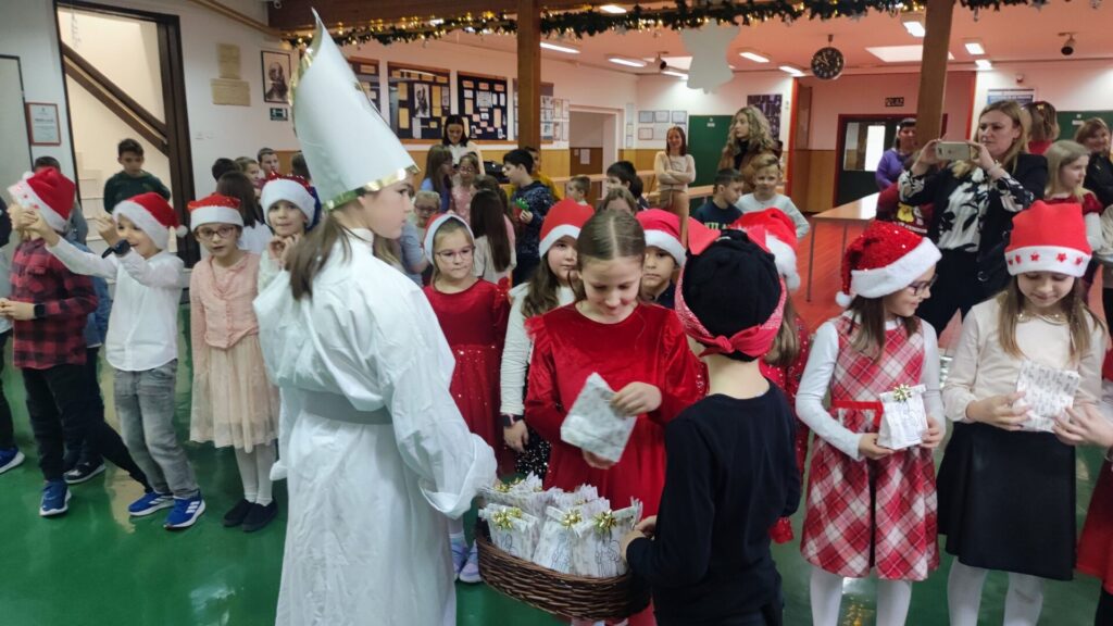Na kraju priredbe su učenici trećih razreda, poput malih pomagača sv. Nikole, prvim razredima podijelili prigodne paketiće. Učenici prvih razreda primili su ih s oduševljenjem, a dječjem veselju doista nije bilo kraja. Nakon priredbe su se djeca imala priliku fotografirati s pravim sv. Nikolom koji je stigao kako bi ih pohvalio za sve dobro što su učinili tijekom godine.